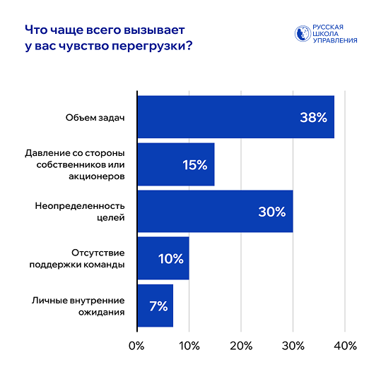 При этом основные источники перегрузки связаны не с людьми, а с системой: 38% респондентов назвали главным негативным фактором объем задач, 30% — неопределенность целей, 15% — давление со стороны собственников. Лишь небольшая часть руководителей связывает усталость с личными факторами: 10% указали на нехватку поддержки команды, 7% — на собственные ожидания.