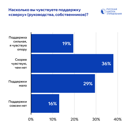 При этом только 19% управленцев уверенно заявили, что чувствуют сильную поддержку со стороны высшего руководства или собственников. Еще 36% «скорее чувствуют, чем нет», но почти половина — 45% — признают: поддержки мало или нет вовсе. В таких условиях руководители остаются один на один с задачами, рисками и ответственностью — без «подстраховки сверху».